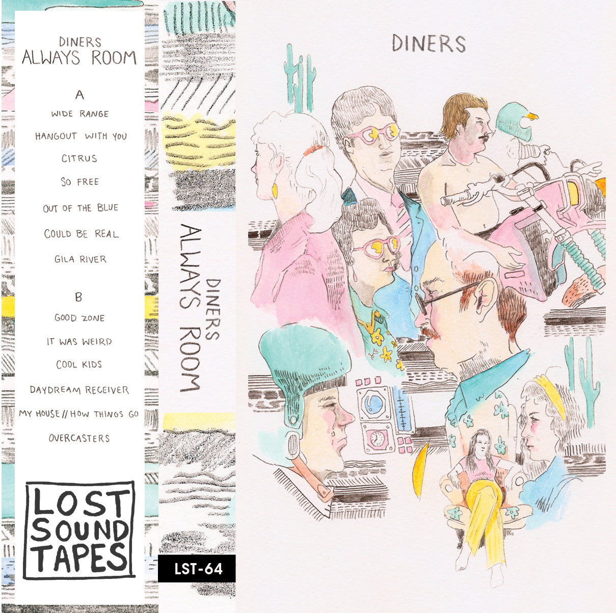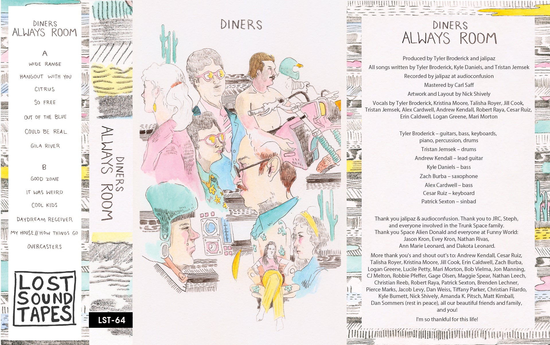Diners, from Phoenix, Arizona, have created a vulnerable and beautiful album for daydreamers. "Always Room" is their debut full length album following their beloved "Throw Me A Ten" 7 song mini-album from 2012. Diners songwriter, Blue Broderick, has created a length album that is perfectly Arizonan, even if direct lyrical references are not present. "Always Room" channels the similarly sunny vibes and disarming honesty of former Phoenician contemporaries iji and French Quarter. Production-wise, the goal was to "make sure that every song had it's own mix and atmosphere, regardless of structure or instrumentation". This is achieve in a variety of ways throughout songs such as "Citrus", "Out Of The Blue", "My House / How Things Go", and "Overcasters" - all of which have distinct and separate moods. Diners "Always Room" will be released on cassette tape and LP in 2014.
