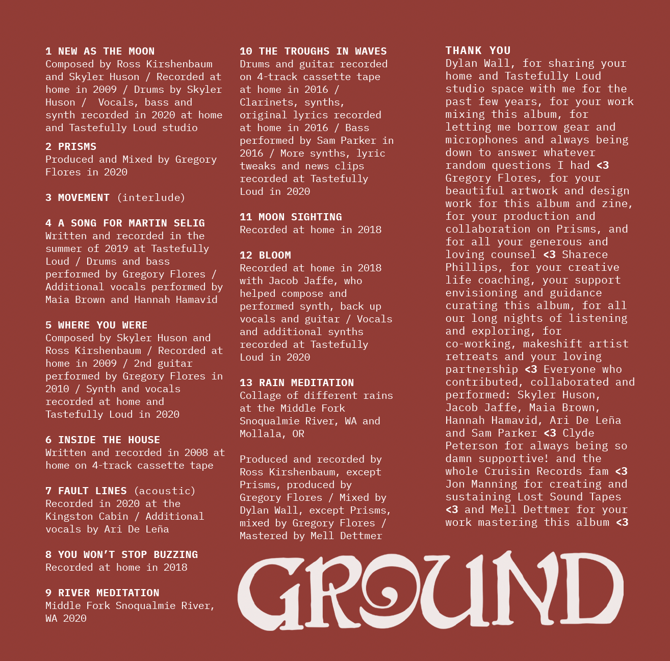 Ground marks a journey of transformation and reflection through the heartbreak of facing a smoldering world and an ongoing pandemic. The tracks are an extension of the political work Kirshenbaum engaged with where he witnessed first-hand the power of collective action to connect with others and shift systems of power. He hopes these songs can offer somatic political awareness, helping people transition from despair and apathy to realizing how deeply needed their contributions are in the struggle towards racial, economic, and climate justice. Drawing from musical influences deeply rooted in rain, vistas, and every shade of green imaginable, Ground seeks to honor the rituals of love, self-healing, and introspection that will ultimately build us a