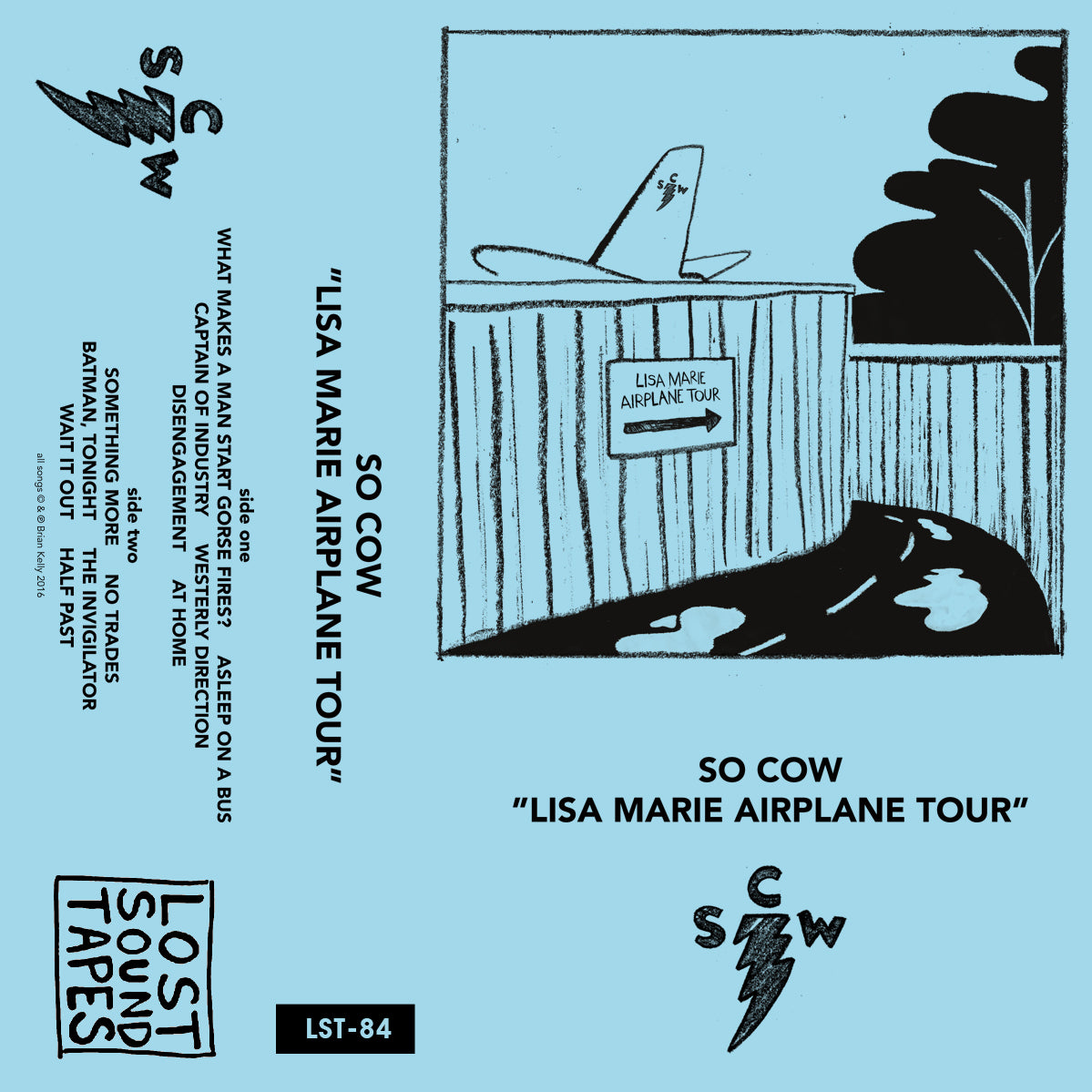"Lisa Marie Airplane Tour" is the fifth So Cow full length, for those counting at home, all written and recorded by Brian Kelly. As he tell it, the album is "12 songs about anxiety; written in the midst of it, but before actually being aware it was the issue. OCD thoughts making a bus journey to town increasingly impossible, social anxiety making ordering a pint at the local bar a drawn-out task of Herculean proportions."